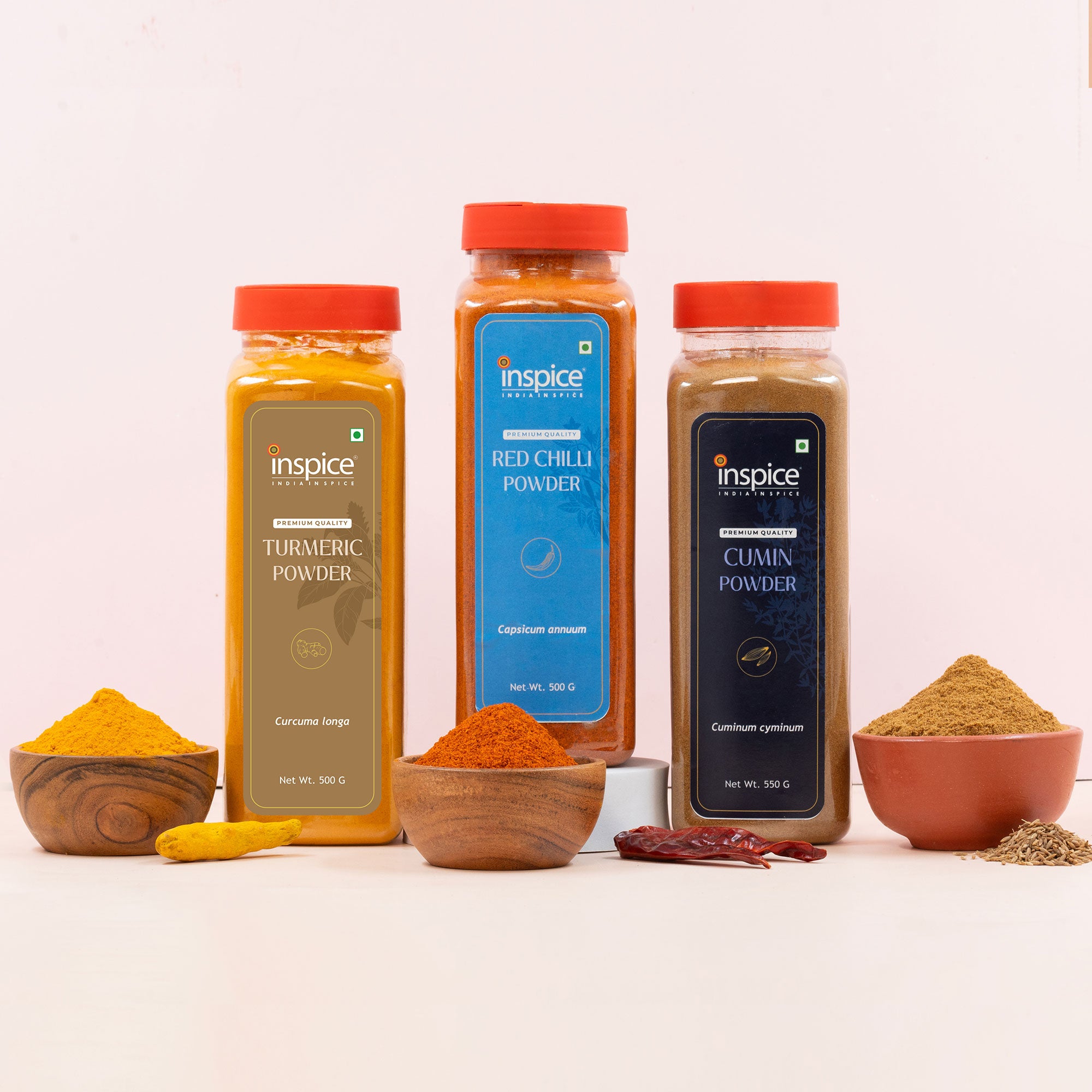 Spicy Medley A perfect everyday spice combo with Inspice Turmeric Powder, Cumin Powder and Red Chilli Powder. Adds natural colour, aroma and flavour to curries, tadka and home-style cooking for daily meals. Turmeric Powder - 500g...